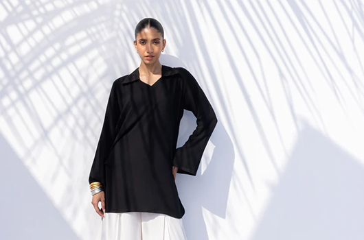 This short black tunic comes with a signature collar with tone on tone cord embroidery and complementary button details on the back. The tunic is made in breathable boski linen making it trans-seasonal and everlasting. Complete with our signature M by Mahira tassel on one side of the tunic! Our black tunic pairs perfectly with our white flared pants and can also be bought as a separate.