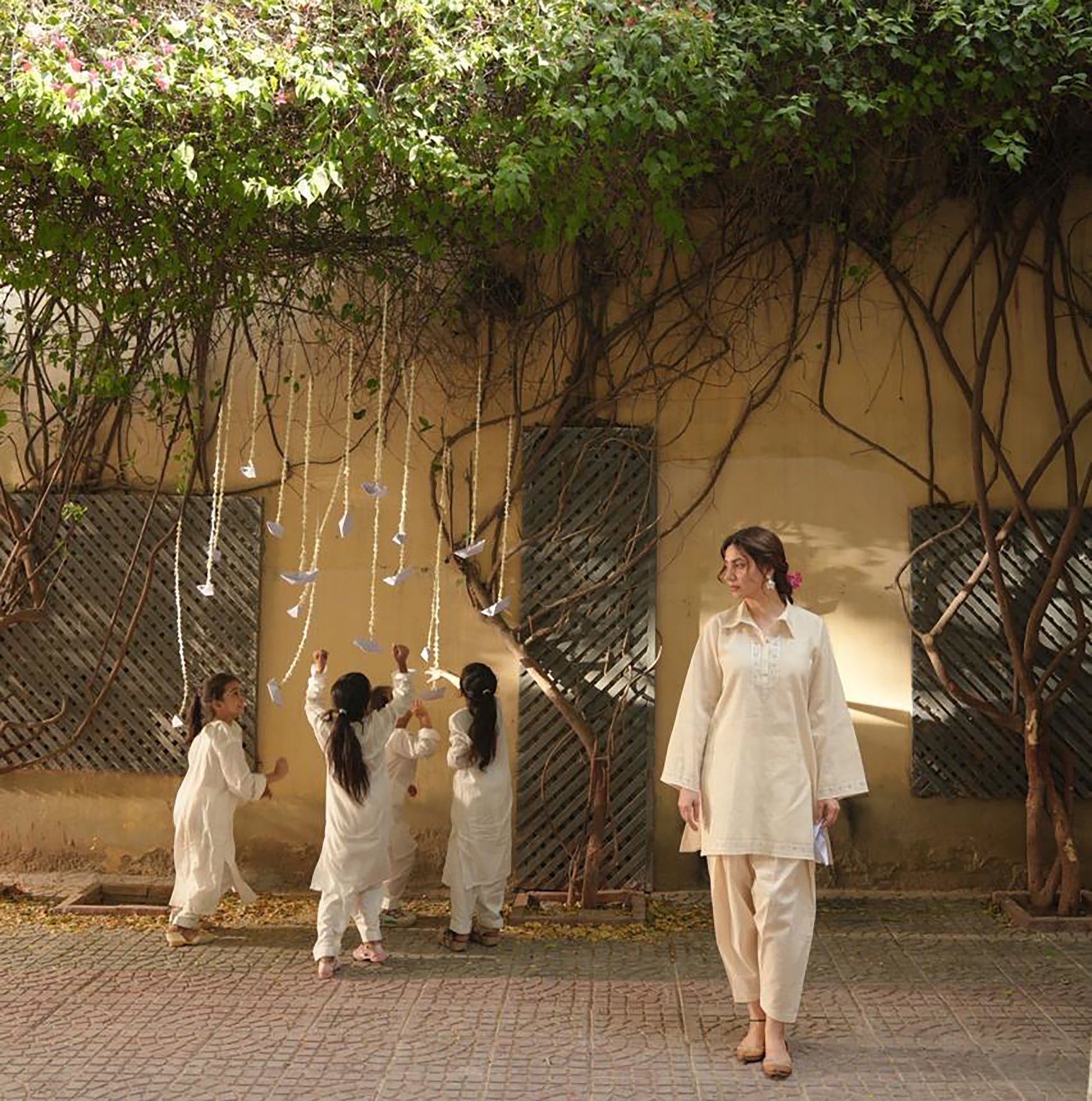 A contemporary twist on a timeless tradition, the Seher set blends modernity with intricate hand-embroidery. Crafted using cotton, the short shirt features tarkashi and fishbone stitches along the neckline, sleeves and daman, while the collar is adorned with a crafted detail for a subtle modern edge. Paired with a classic khadi shalwar, this ensemble captures the emotion of carefree childhood afternoons.